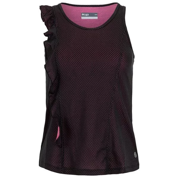 Lija Women’s Ruffle Tank is a beautiful light and airy chocolate brown with a touch of dark pink. Scooped neck and a soft side ruffle look fabulous on the court!