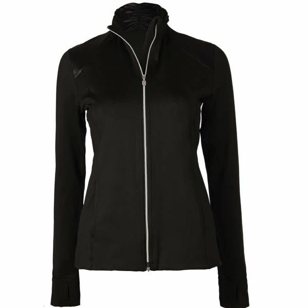 Sofibella Dark Knight Tennis Jacket is a nicely fitted jacket with a double zipper, side pockets and thumbholes, and leather like fabric on shoulders. Mock collar.