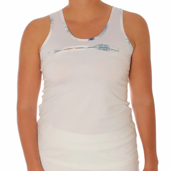Sofibella Harmonia Chain Tank is a solid white tank with the pretty floral ink print on shoulders, neckline and above the bust. Features a scoop neck and full back. Flattering fit.