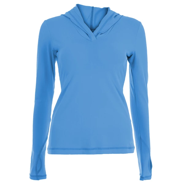 Sofibella Hoodie Long Sleeve Top features a solid reflect blue color with a hood and thumbholes on sleeves. Great fit and the usual beautiful soft Sofibella fabric.