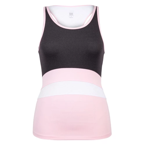 Tail Berries N Cream Melodic Tank is a 23 inch fitted racerback tank. Features different shades of parfait pink and black heather with embossed diamond fabric on middle.