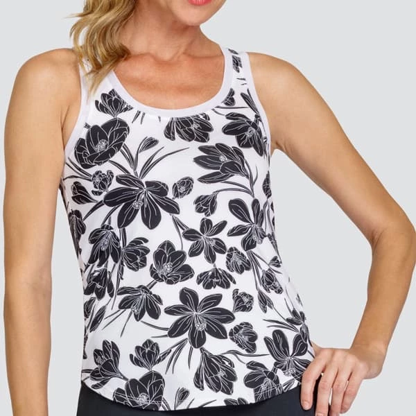 Tail Mia Tank Tank features an all over crocus meadow print, curved hem, and back inserts. The print is soft and not too bold. Comfortable fit.