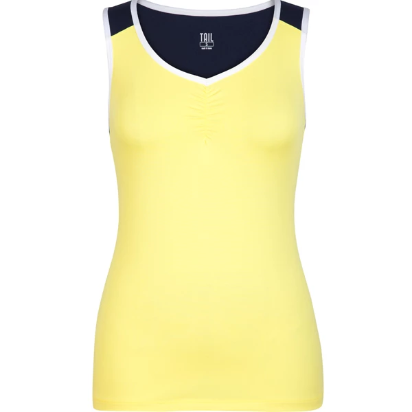 Tail Navy Regatta Taura Tank is a cute lemon fizz tank with a slight v neckline. Racerback with a little ruching on the front center.